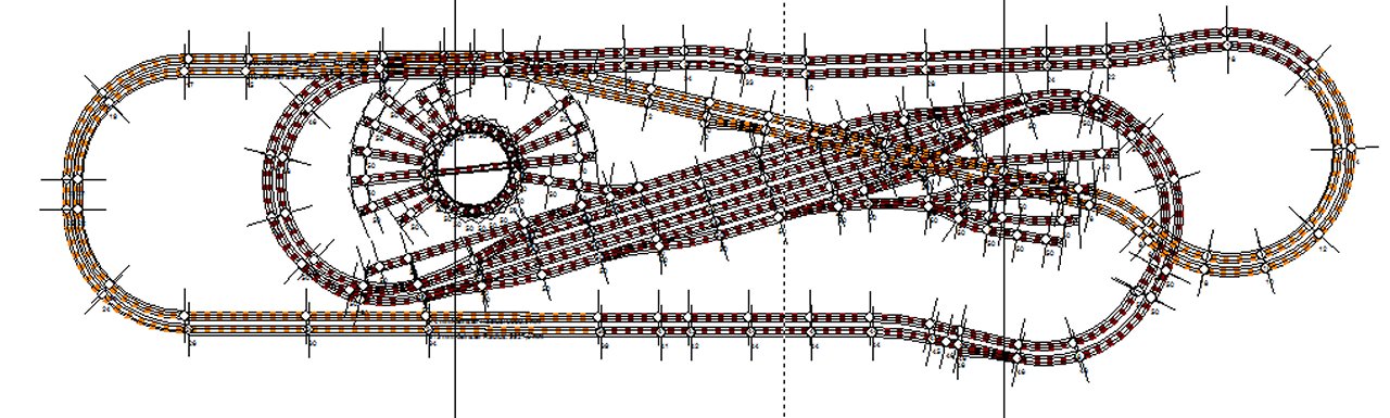 nicht mit Oberleitung versehen werden soll. Ein Dampf BW mit einer Drehscheibe ist vorgesehen und im rechten, mittleren Teil ist ein Sägewerk mit entsprechenden Gleisanschlüssen und Abstellmöglichkeiten geplant. Im Bahnhof finden 4 Züge Platz, da die restlichen Gleise für den Rangierbetrieb benötigt werden. Somit ist gleichzeitiger Betrieb von 4 Zügen möglich. Wobei dieser Anlagenteil wirklich zum reinen ‚Spielen‘ dienen soll. Die Steuerung beschränkt sich auf ein Minimum. So wird es Einfahrt- und Ausfahrtsignale sowie entsprechende Bremsstrecken im Bahnhofsbereich geben. Die Streckenführung entspricht einer abstrakten acht und ist zweigleisig ausgeführt. Entsprechend wird es Steigungen geben, Tunnels und Brücken / Viadukte. Außerdem kann von dem unter dem Bahnhof befindlichen Gleisen in den Rangierbereich über dem ‚Hauptbahnhof‘ gefahren werden. Ein weiterer Abzweig im rechten unteren Teil, stellt über eine Auffahrt die Verbindung zur etwas höher gelegenen Nebenbahnstrecke her. Auch dieser Bereich wird voll digital gefahren und gesteuert, wobei es bei der Steuerung einen Fahrdienstleiter braucht. Die Züge bleiben prinzipiell am Einfahrtssignal stehen und werden nach Herstellen der entsprechenden Fahrstraßen manuell weiter geleitet.